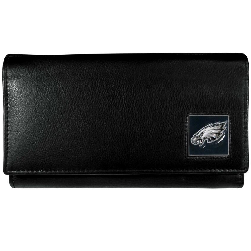 This genuine leather women's pocketbook features 9 credit card slots, a windowed ID slot, spacious front pocket, inner pocket and zippered coin pocket. The front of the pocketbook has a hand painted metal square with the Philadelphia Eagles primary logo.