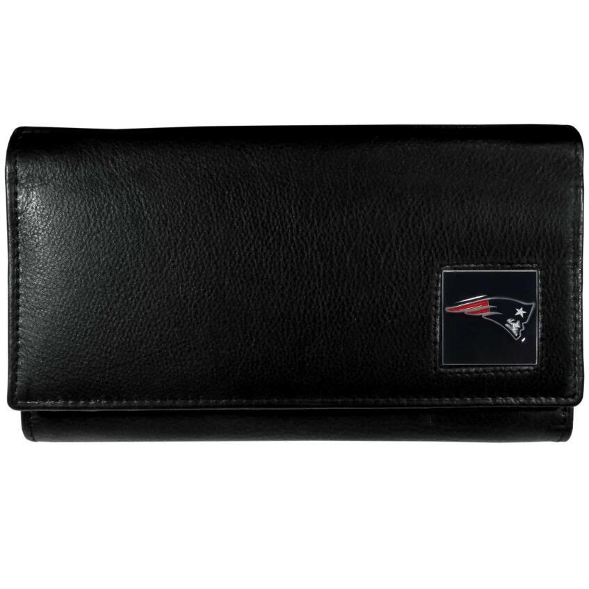 This genuine leather women's pocketbook features 9 credit card slots, a windowed ID slot, spacious front pocket, inner pocket and zippered coin pocket. The front of the pocketbook has a hand painted metal square with the New England Patriots primary logo.