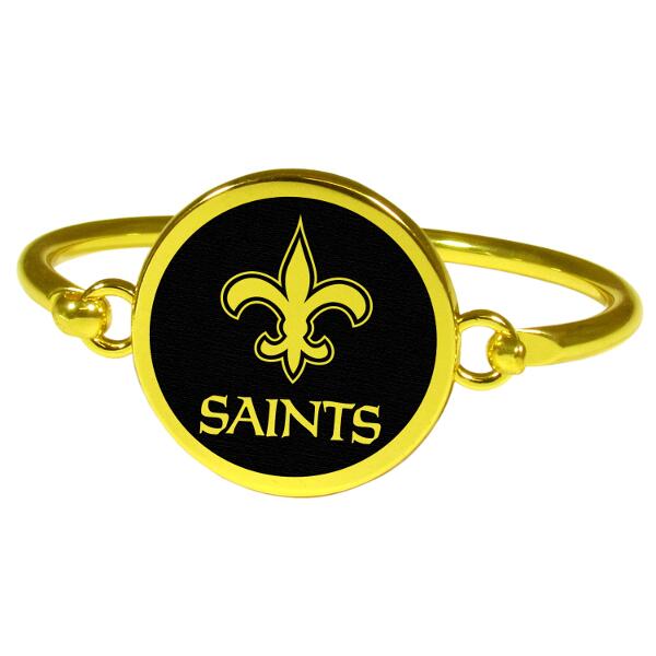 This beautiful gold toned bangle bracelet is a feminine way to show off your love of the New Orleans Saints. The bangle features an easy to use hook and eye clasp that has a large, round centerpiece that features a monochromatic, black logo. This classy look is sure to turn heads and is understated enough for everyday wear.