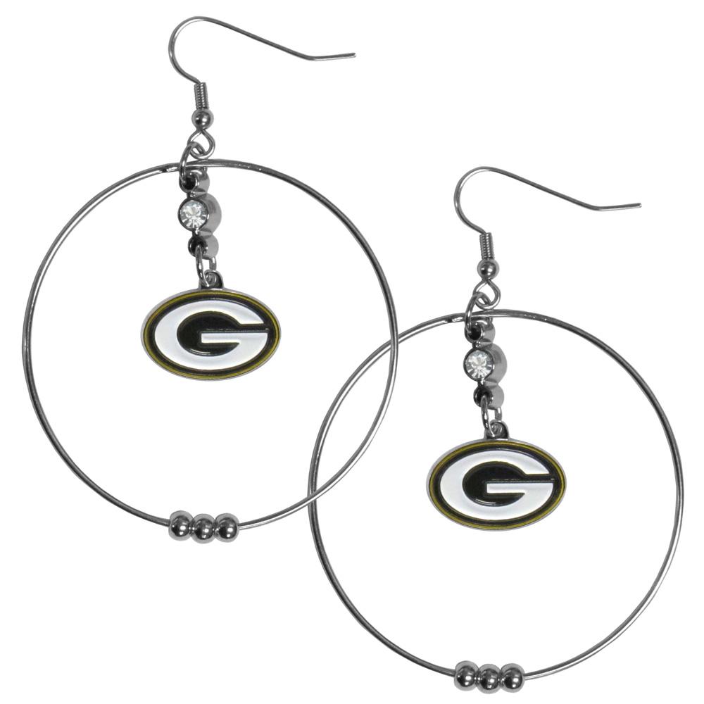 Our large hoop earrings have a fully cast and enameled Green Bay Packers charm with enameled detail and a high polish nickel free chrome finish and rhinestone access. Hypoallergenic fishhook posts.