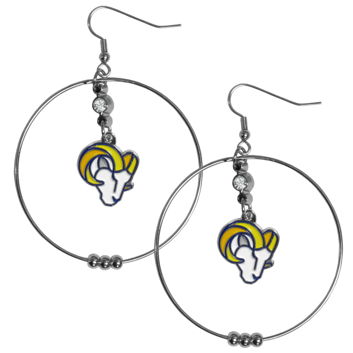 Our large hoop earrings have a fully cast and enameled Los Angeles Rams charm with enameled detail and a high polish nickel free chrome finish and rhinestone access. Hypoallergenic fishhook posts.