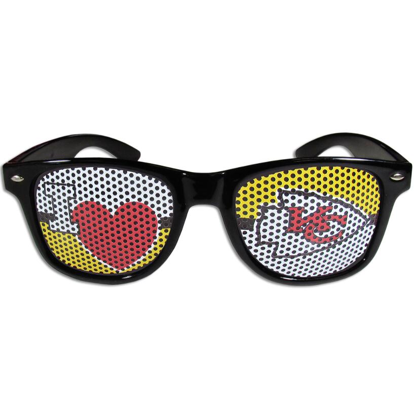 Our officially licensed I Heart game day shades are the perfect accessory for the devoted Kansas City Chiefs fan! The sunglasses have durable polycarbonate frames with flex hinges for comfort and damage resistance. The lenses feature brightly colored team clings that are perforated for visibility.