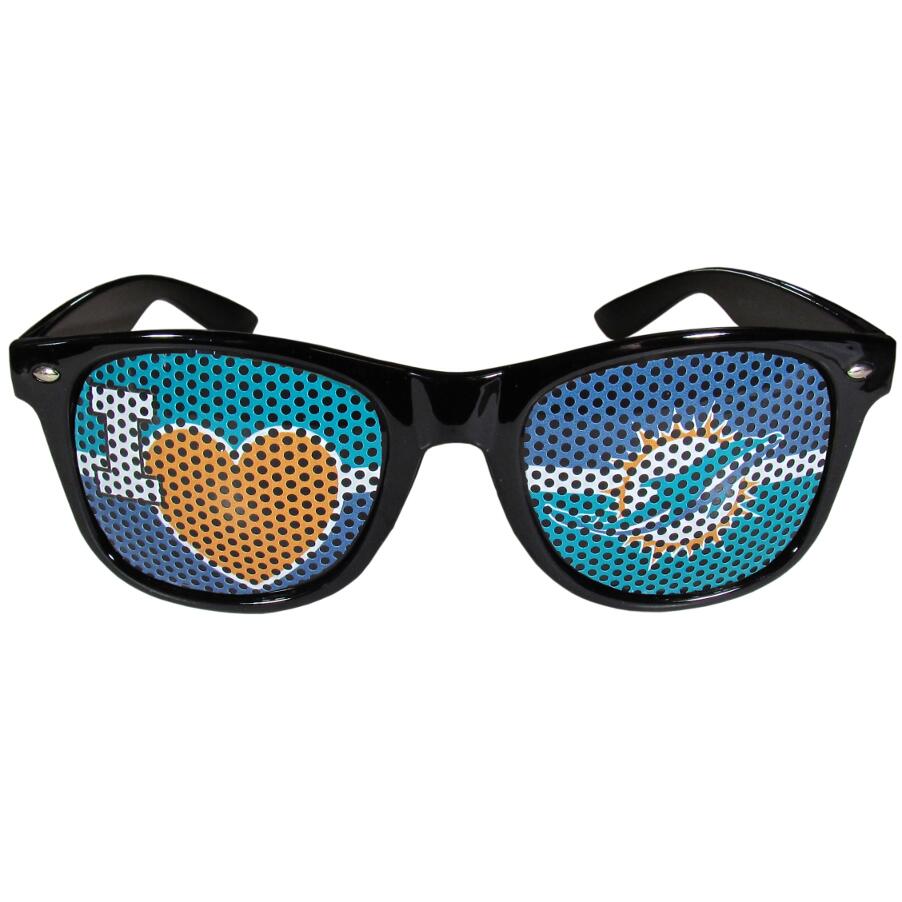 Our officially licensed I Heart game day shades are the perfect accessory for the devoted Miami Dolphins fan! The sunglasses have durable polycarbonate frames with flex hinges for comfort and damage resistance. The lenses feature brightly colored team clings that are perforated for visibility.