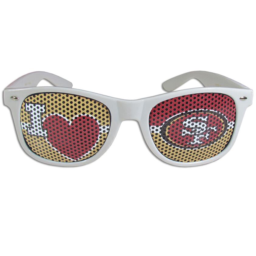 Our officially licensed I Heart game day shades are the perfect accessory for the devoted San Francisco 49ers fan! The sunglasses have durable polycarbonate frames with flex hinges for comfort and damage resistance. The lenses feature brightly colored team clings that are perforated for visibility.