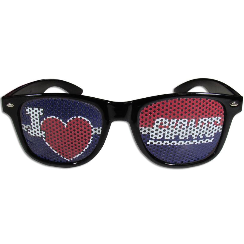 Our officially licensed I Heart game day shades are the perfect accessory for the devoted New York Giants fan! The sunglasses have durable polycarbonate frames with flex hinges for comfort and damage resistance. The lenses feature brightly colored team clings that are perforated for visibility.