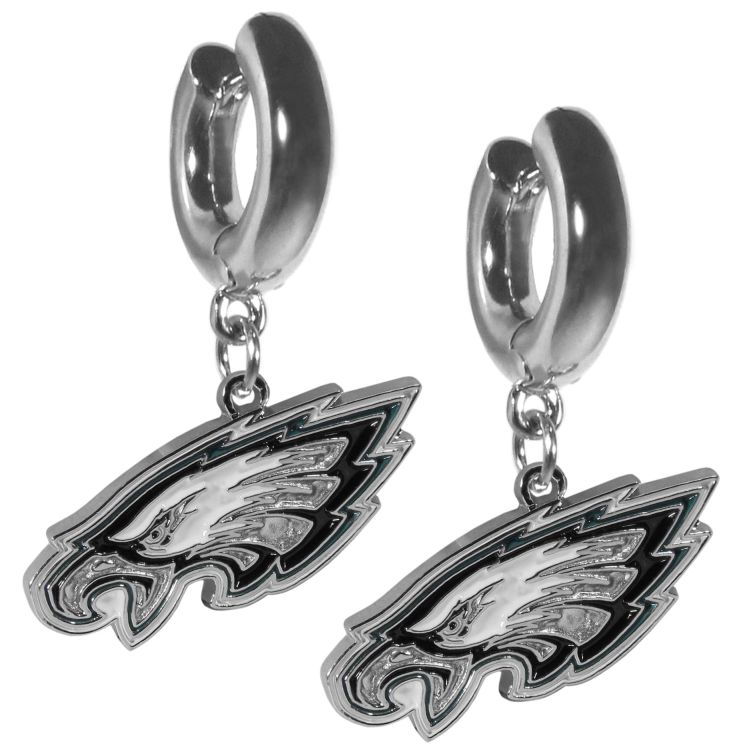 Our Philadelphia Eagles huggie hoop earrings have a classic style with a sporty twist. The chunky hoop is 3/4 inch diameter and 1/4 inch thickness with a fully cast metal team charm. The simple lock clasp on the earrings makes them very secure during all types of activity.