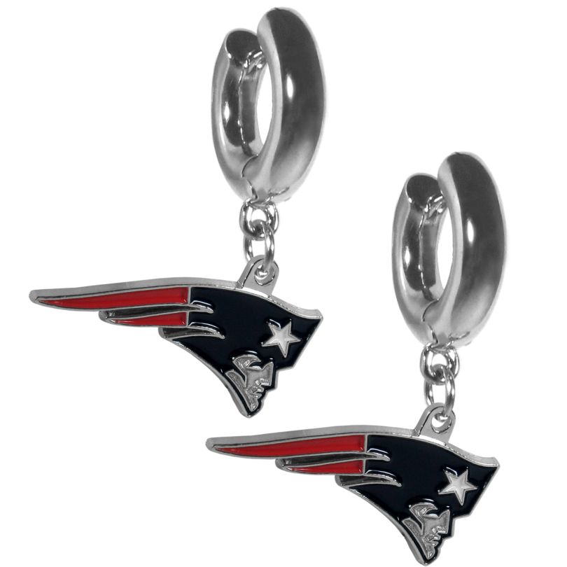 Our New England Patriots huggie hoop earrings have a classic style with a sporty twist. The chunky hoop is 3/4 inch diameter and 1/4 inch thickness with a fully cast metal team charm. The simple lock clasp on the earrings makes them very secure during all types of activity.