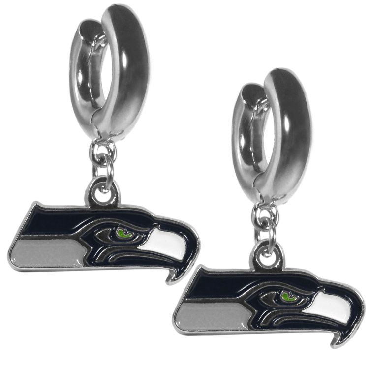 Our Seattle Seahawks huggie hoop earrings have a classic style with a sporty twist. The chunky hoop is 3/4 inch diameter and 1/4 inch thickness with a fully cast metal team charm. The simple lock clasp on the earrings makes them very secure during all types of activity.