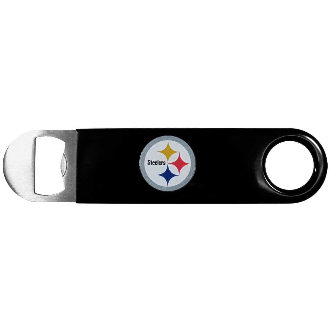 This heavy-duty steel opener is extra long, with a durable vinyl covering. The extra length provides more leverage for speed opening and the opener features a large printed Pittsburgh Steelers logo.
