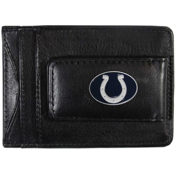 Our Indianapolis Colts genuine leather cash & cardholder is a great alternative to the traditional bulky wallet. This compact wallet has credit card slots, windowed ID slot and a magnetic money clip that will not damage your credit cards. The wallet features a metal team emblem.