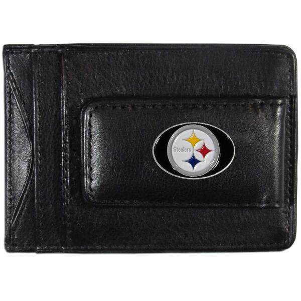 Our Pittsburgh Steelers genuine leather cash & cardholder is a great alternative to the traditional bulky wallet. This compact wallet has credit card slots, windowed ID slot and a magnetic money clip that will not damage your credit cards. The wallet features a metal team emblem.