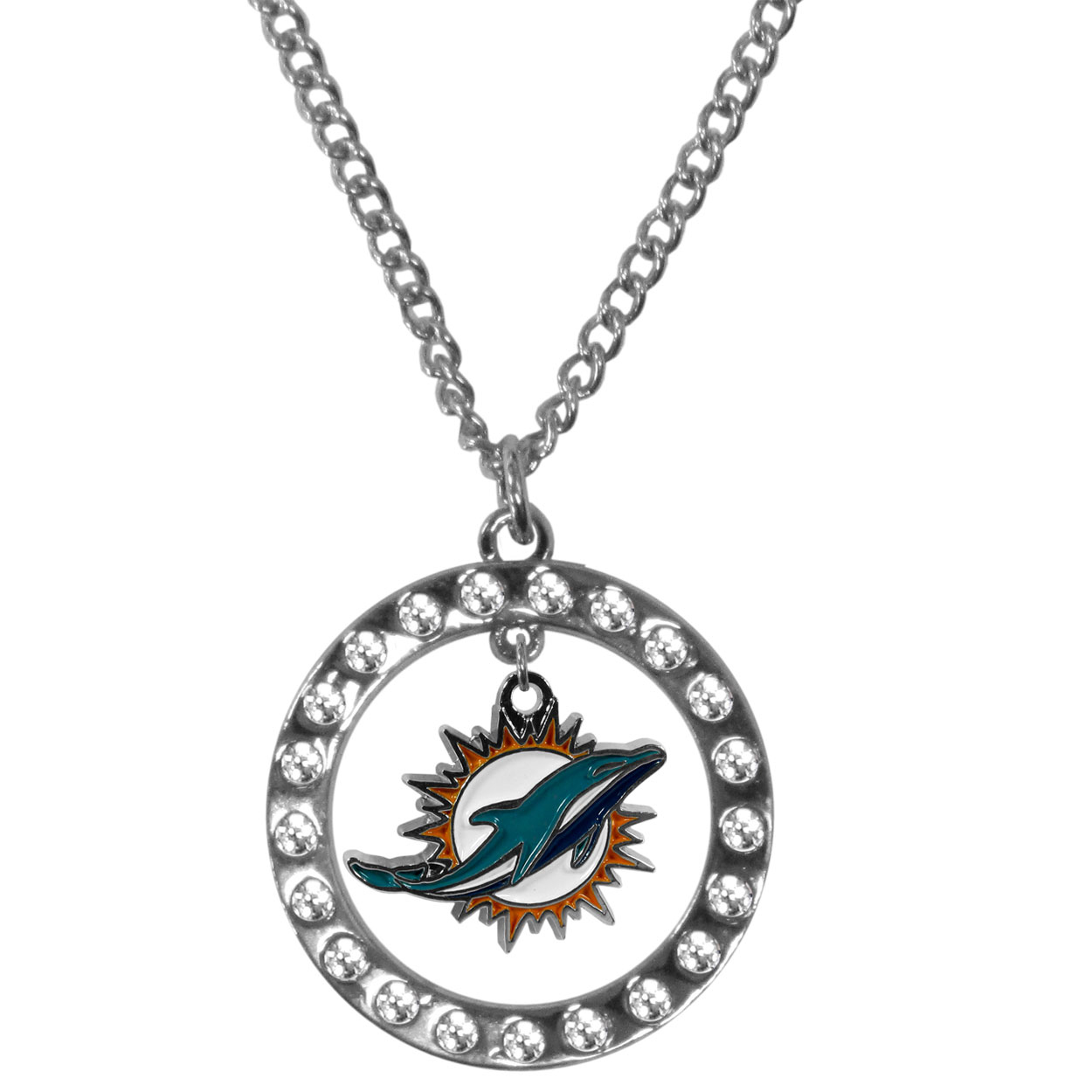 Our Miami Dolphins rhinestone hoop necklace comes on an 18 inch chain and features a hoop covered in rhinestones with a high polish chrome finish and a cast and enameled team charm dangling in the center.