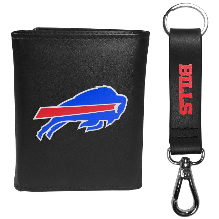 Our classic fine leather tri-fold wallet is meticulously crafted with genuine leather that will age beautifully so you will have a quality wallet for years to come. This is fan apparel at its finest. The wallet is packed with organizational features; lots of credit card slots, large billfold pocket, and a window ID slot. The front of the wallet features an extra large Buffalo Bills printed logo. Comes with a stylish black strap key chain with clip to easily attach to belts, backpacks or purses.