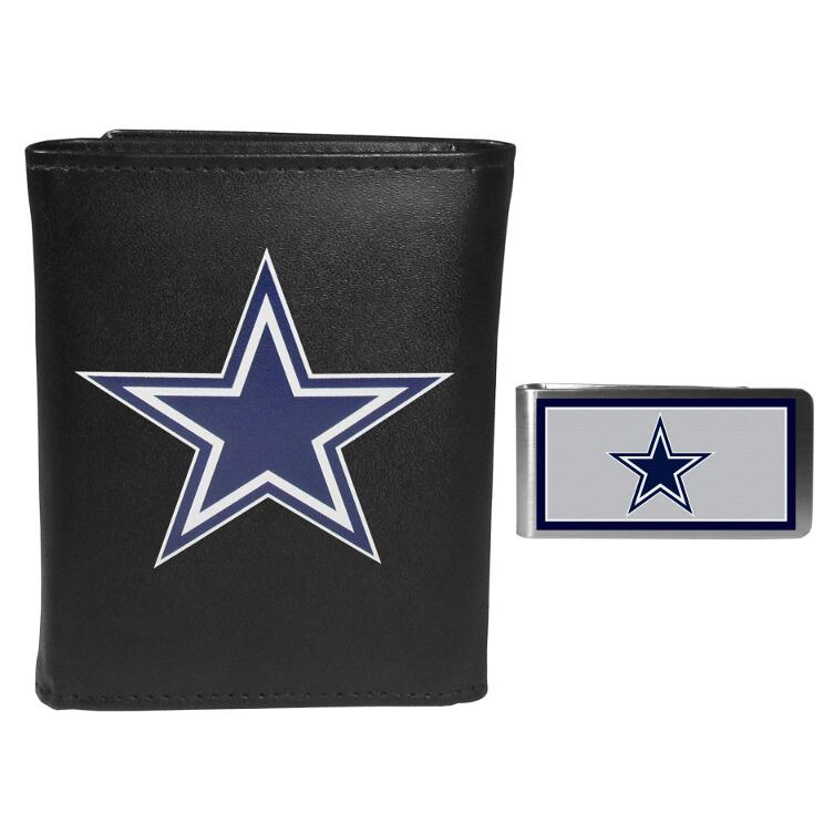 Our classic fine leather tri-fold wallet is meticulously crafted with genuine leather that will age beautifully so you will have a quality wallet for years to come. This is fan apparel at its finest. The wallet is packed with organizational features; lots of credit card slots, large billfold pocket, and a window ID slot. The front of the wallet features an extra large Dallas Cowboys printed logo. The set comes with separate steel money clip with a full color team design.