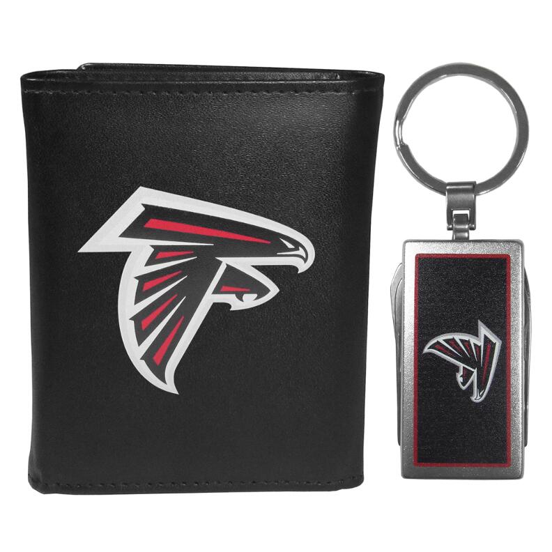 Our classic fine leather tri-fold wallet is meticulously crafted with genuine leather that will age beautifully so you will have a quality wallet for years to come. This is fan apparel at its finest. The wallet is packed with organizational features; lots of credit card slots, large billfold pocket, and a window ID slot. The front of the wallet features an extra large Atlanta Falcons printed logo. Comes with our multi-tool keychain which features a bottle opener, scissors, knife, nail file and screw driver.