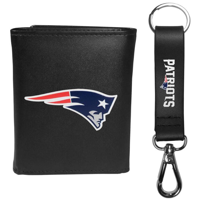 Our classic fine leather tri-fold wallet is meticulously crafted with genuine leather that will age beautifully so you will have a quality wallet for years to come. This is fan apparel at its finest. The wallet is packed with organizational features; lots of credit card slots, large billfold pocket, and a window ID slot. The front of the wallet features an extra large New England Patriots printed logo. Comes with a stylish black strap key chain with clip to easily attach to belts, backpacks or purses.