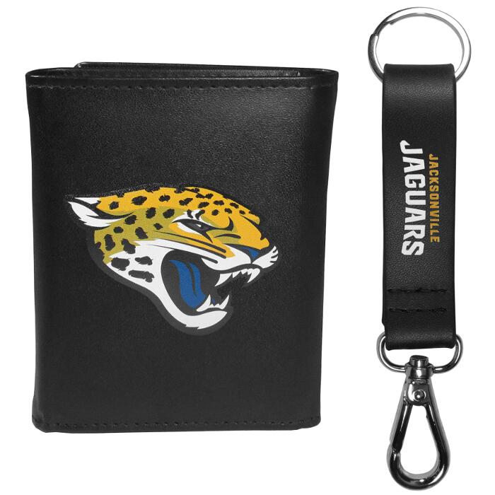 Our classic fine leather tri-fold wallet is meticulously crafted with genuine leather that will age beautifully so you will have a quality wallet for years to come. This is fan apparel at its finest. The wallet is packed with organizational features; lots of credit card slots, large billfold pocket, and a window ID slot. The front of the wallet features an extra large Jacksonville Jaguars printed logo. Comes with a stylish black strap key chain with clip to easily attach to belts, backpacks or purses.