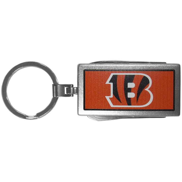 Be the hero at the tailgate, camping, or on a Friday night with your Cincinnati Bengals Multi-Tool Keychain which comes complete with bottle opener, scissors, knife, nail file and screw driver. Be it opening a package or a beverage Siskiyou's Multi-Tool Keychain goes wherever your keys do. The keychain hangs at 4 inches long when closed.