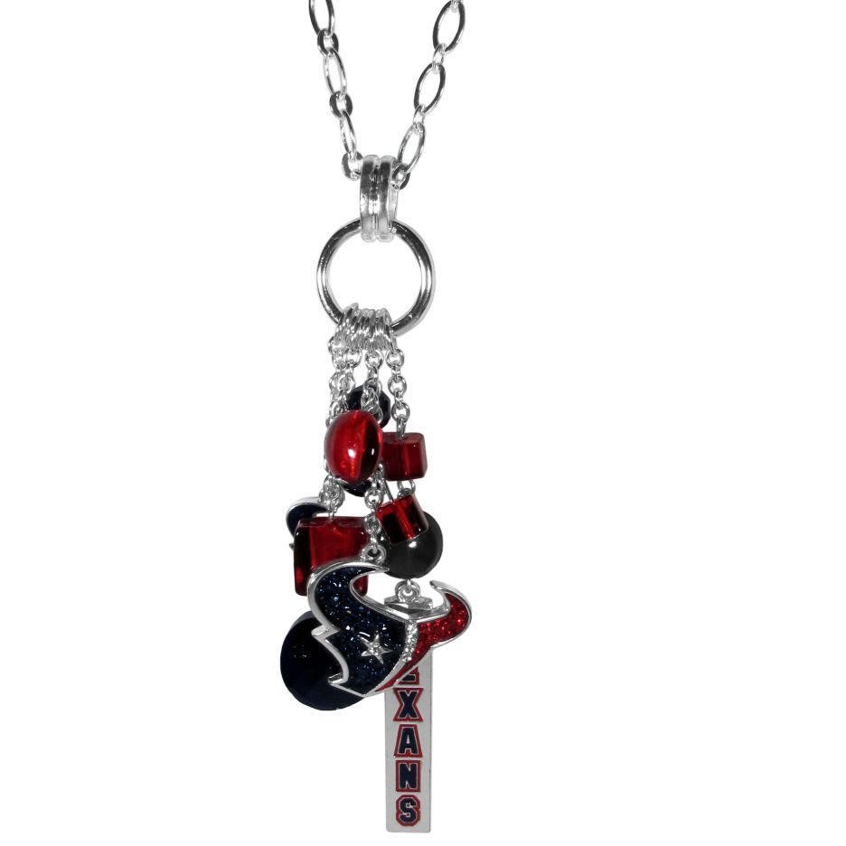 Our trendy cluster necklace makes a big statement with a 30 inch, silver plated, link chain that features a stylish cluster of Houston Texans charms that hang an additional 4 inches off of the chain. This bold fashion jewelry piece has 4 chain lenghts in the cluster that have alternating color bauble beads and 2 metal team charms, one with crystals and a long bar charm with the team name.