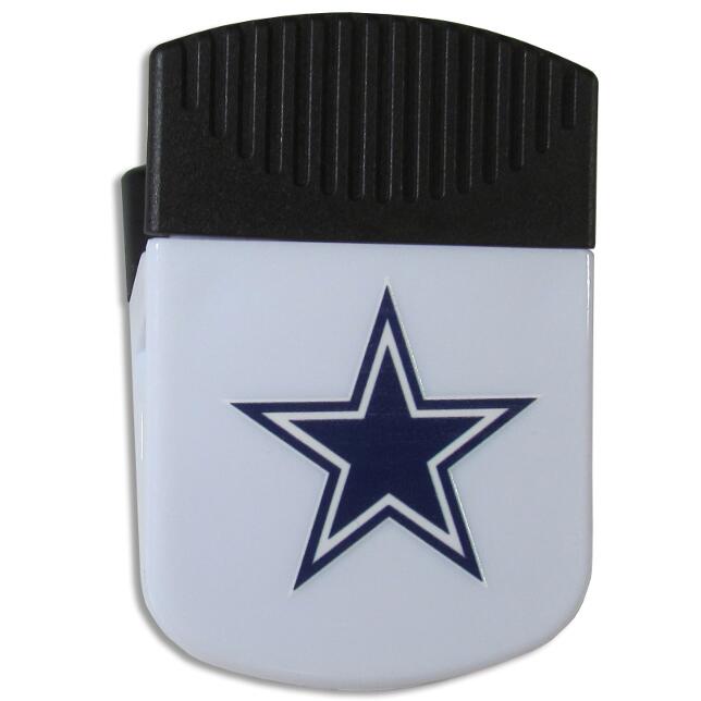 Use this attractive clip magnet to hold memos, photos or appointment cards on the fridge or take it down keep use it to clip bags shut. The magnet features a silk screened Dallas Cowboys logo.