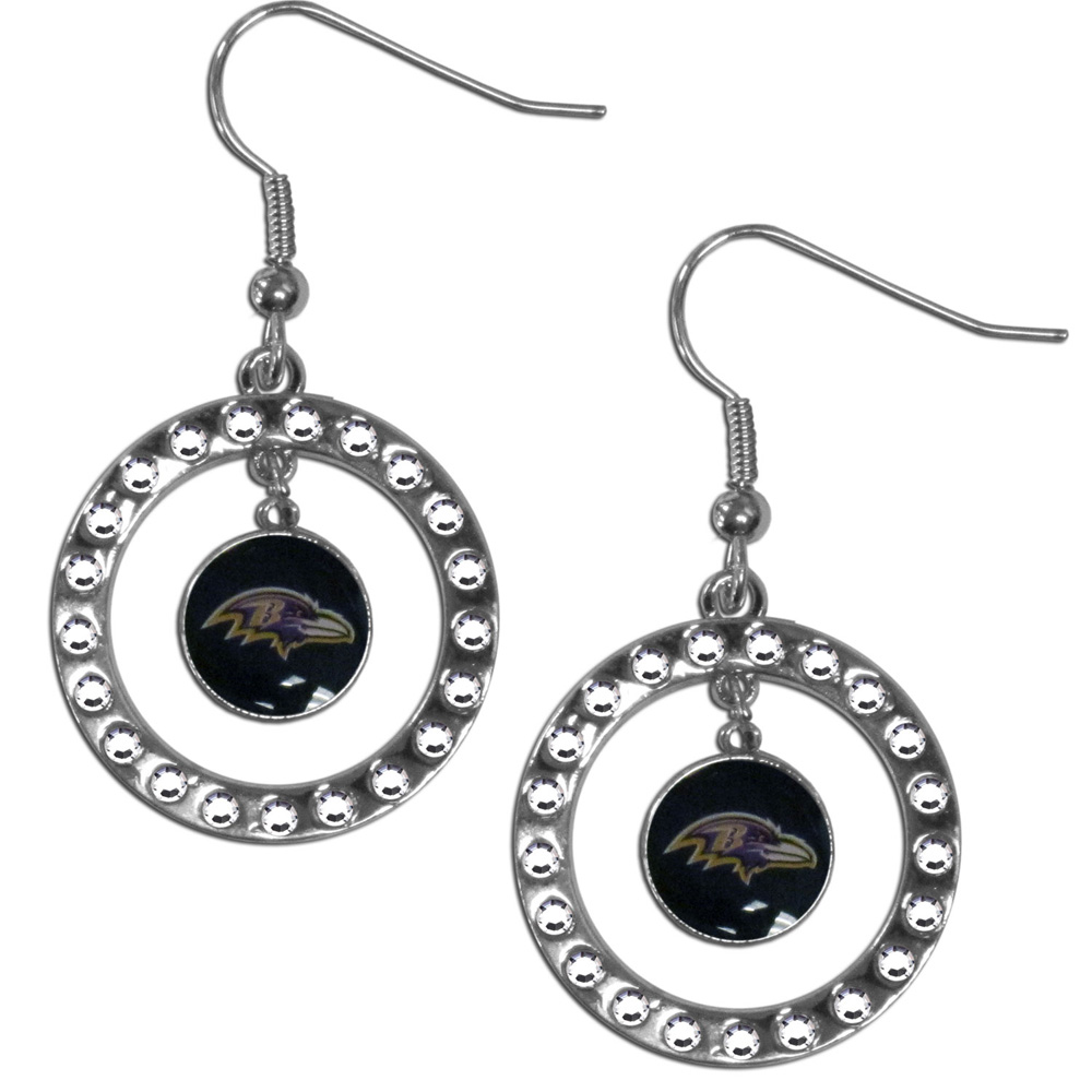 Our officially licensed rhinestone hoop earrings comes on an hypo-allergenic fishhook posts and features a hoop covered in rhinestones with a high polish chrome finish and a Baltimore Ravens logo dangling in the center.