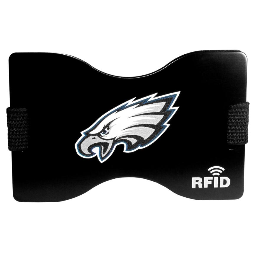 Our RFID blocking wallet and moneyclip is designed to help protect you from falling victim to a particular brand of electronic pickpocketing call RFID skimming. RFID skimming allows a criminal to scan your cards with chips and read your personal information. This attractive Philadelphia Eagles wallet protects against this threat while also meeting all of your slim wallet needs. Store your cards in between the expandable RFID plates and store you cash in the handy outer money clip.