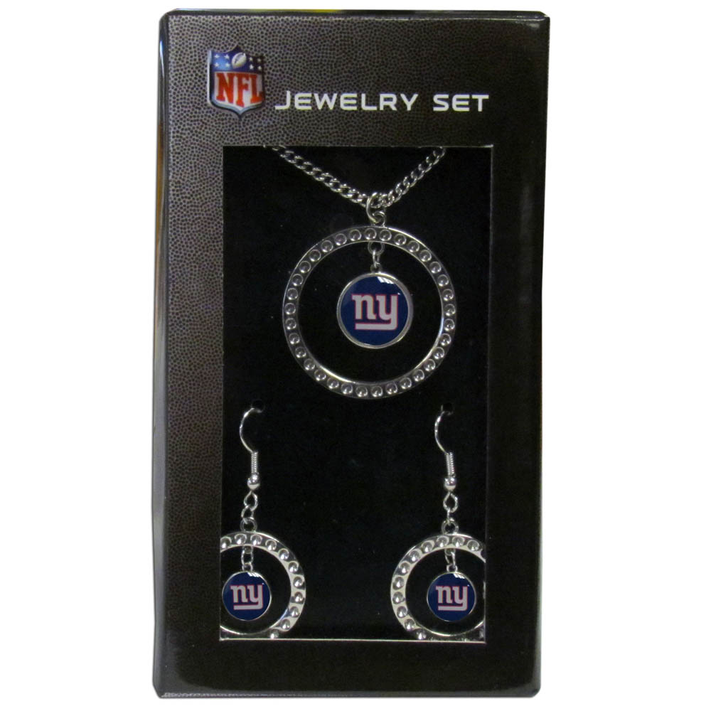 This officially licensed New York Giants jewelry set includes our rhinestone hoop earrings and pendant in a gift box. The 1 inch rhinestone hoop pendant comes on an 18 inch chain and is paired with the matching dangle hoop earrings.