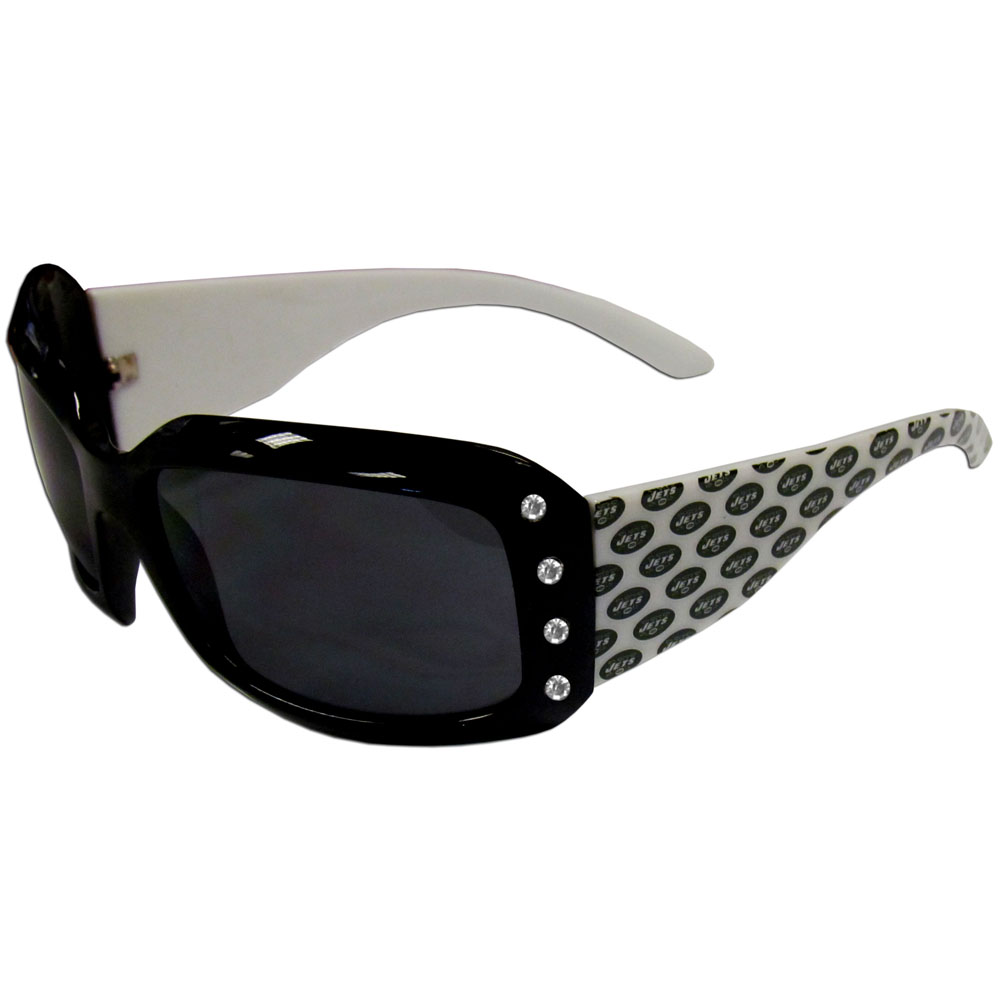 Our designer women's sunglasses have a repeating New York Jets logo design on the team colored arms and rhinestone accents. 100% UVA/UVB protection.