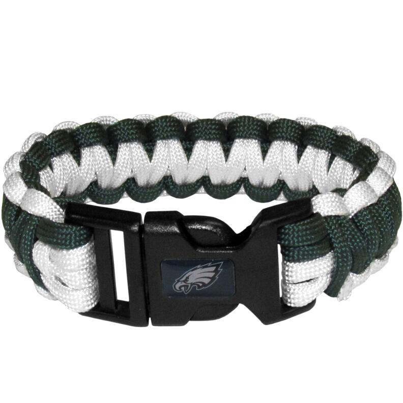 Our functional and fashionable Philadelphia Eagles survivor bracelets contain 2 individual 300lb test paracord rated cords that are each 5 feet long. The team colored cords can be pulled apart to be used in any number of emergencies and look great while worn. The bracelet features a team emblem on the clasp.