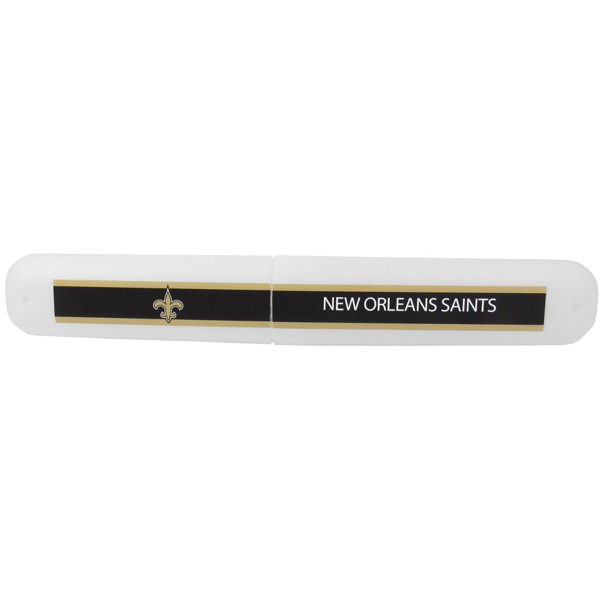 Let your toothbrush travel in style with our New Orleans Saints toothbrush case. The case snaps together in the center to keep your toothbrush and travel case clean while traveling. The case features full team graphics down the lenght of the case.