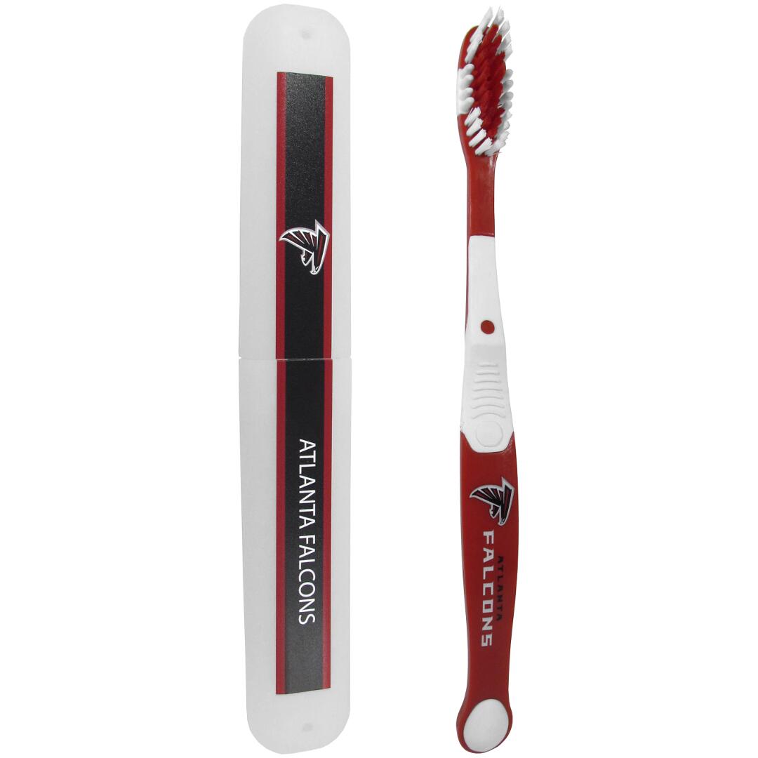 Why have a boring old toothbrush when you can have the MVP of toothbrushes! This cool Atlanta Falcons toothbrush features crisp team graphics on a team colored toothbrush. This is no simple novelty item though, it is a high-quality hygiene device with soft bristles for a gentle clean and rubber gum massagers on the sides of the bristles. The toothbrush comes with a travel case featuring team colors and logo.