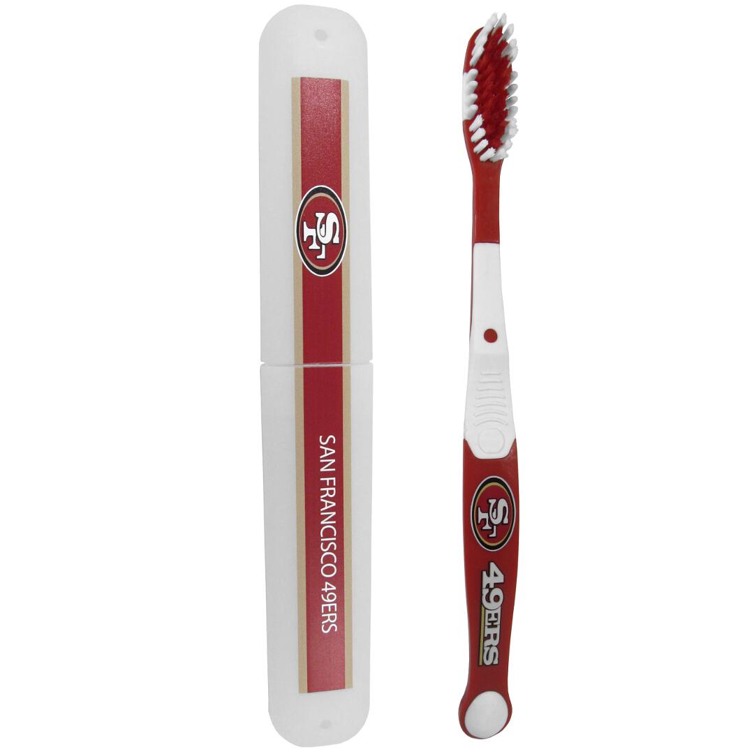 Why have a boring old toothbrush when you can have the MVP of toothbrushes! This cool San Francisco 49ers toothbrush features crisp team graphics on a team colored toothbrush. This is no simple novelty item though, it is a high-quality hygiene device with soft bristles for a gentle clean and rubber gum massagers on the sides of the bristles. The toothbrush comes with a travel case featuring team colors and logo.