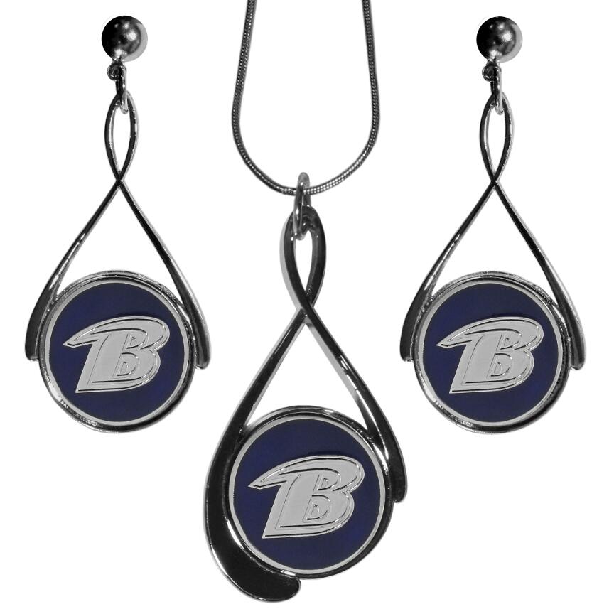 Our Baltimore Ravens tear drop earrings and necklace set is a sporty twist on the classic tear drop style. The high polish dangle earrings feature the team logo in raised metal against the primary team color inset into the 2 inch tear drop setting paired with a beautiful matching necklace with a 18 inch snake chain with 2 inch extendor. The earrings have hypoallergenic stud posts.