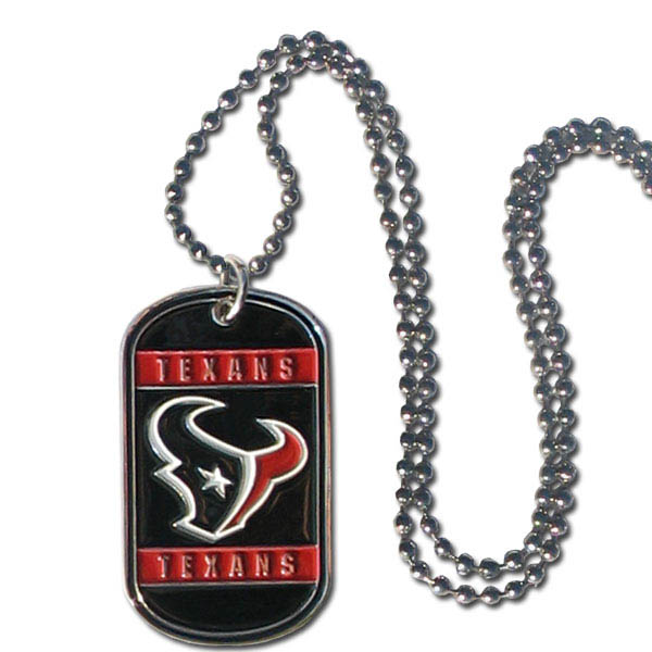 Expertly crafted Houston Texans tag necklaces featuring fine detailing and a hand enameled finish with chrome accents. 26"Chain.