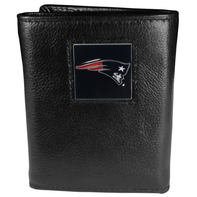Our New England Patriots leather tri-fold wallet features a sculpted and hand painted team square on a black leather tri-fold. Includes an ID window, slots for credit cards and clear plastic photo sleeves. For a sporty feel, the liner of the wallet is made with a canvas liner.