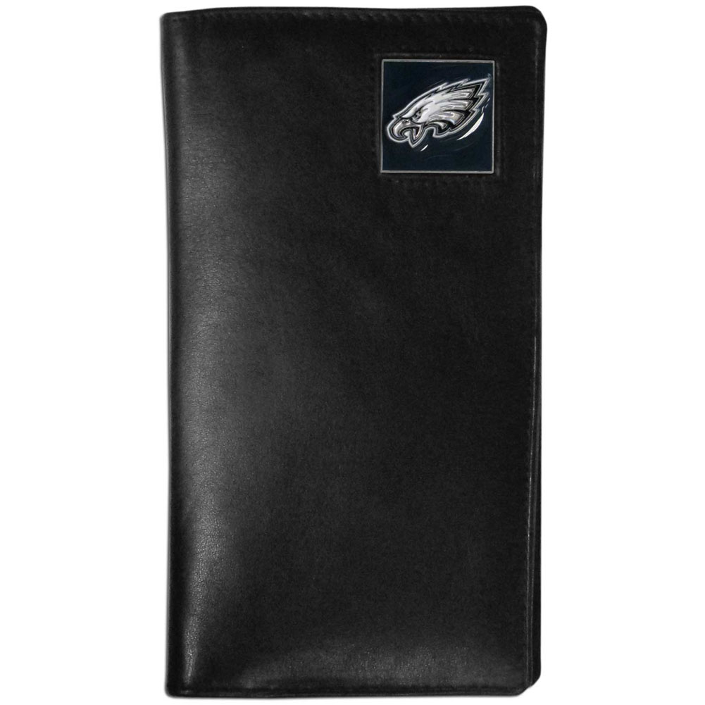 Our officially licensed tall leather wallet cover is made of high quality leather with a fully cast metal Philadelphia Eagles emblem with enameled team color detail. The cover fits both side and top loaded checks and includes a large zippered pocket, windowed ID slot, numerous credit card slots and billfold pocket.