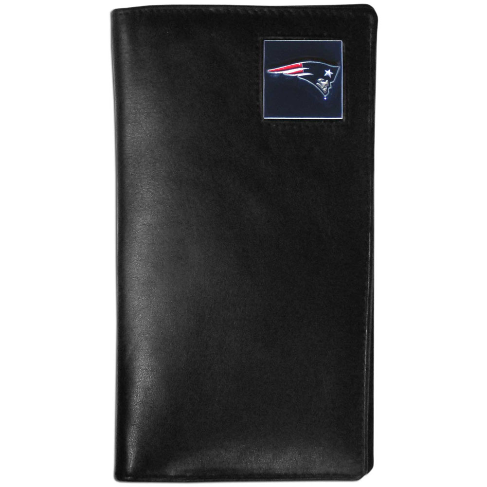 Our officially licensed tall leather wallet cover is made of high quality leather with a fully cast metal New England Patriots emblem with enameled team color detail. The cover fits both side and top loaded checks and includes a large zippered pocket, windowed ID slot, numerous credit card slots and billfold pocket.