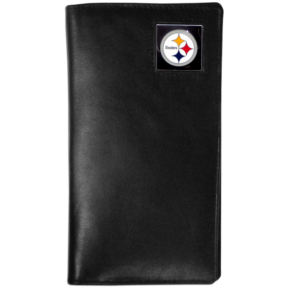 Our officially licensed tall leather wallet cover is made of high quality leather with a fully cast metal Pittsburgh Steelers emblem with enameled team color detail. The cover fits both side and top loaded checks and includes a large zippered pocket, windowed ID slot, numerous credit card slots and billfold pocket.