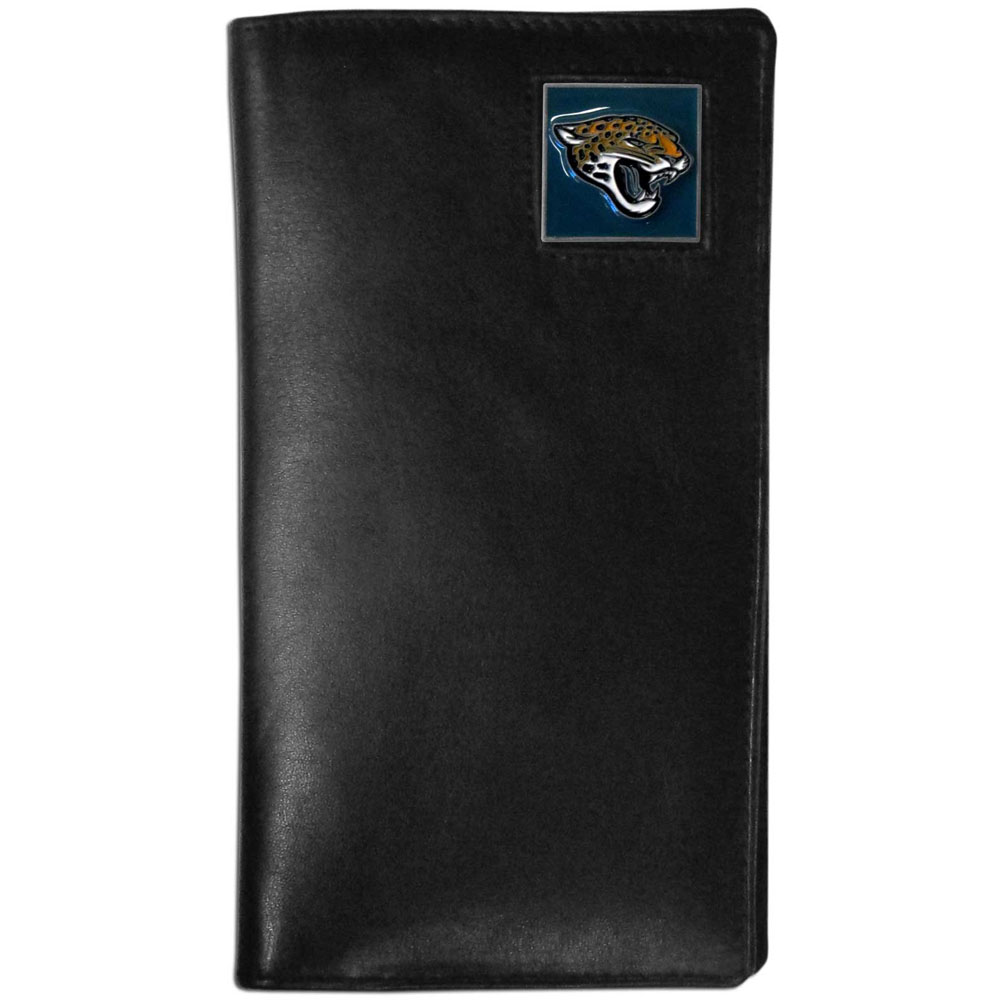 Our officially licensed tall leather wallet cover is made of high quality leather with a fully cast metal Jacksonville Jaguars emblem with enameled team color detail. The cover fits both side and top loaded checks and includes a large zippered pocket, windowed ID slot, numerous credit card slots and billfold pocket.