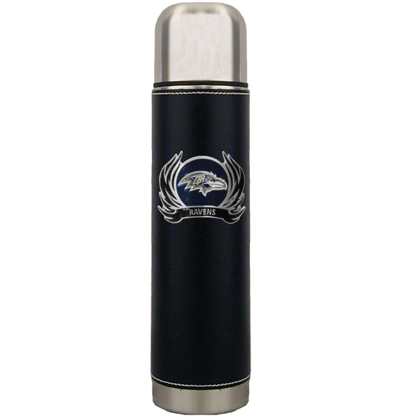 Keep your drinks piping hot for the big game with our officially licensed 26 ounce thermos featuring a cast & enameled Baltimore Ravens emblem.