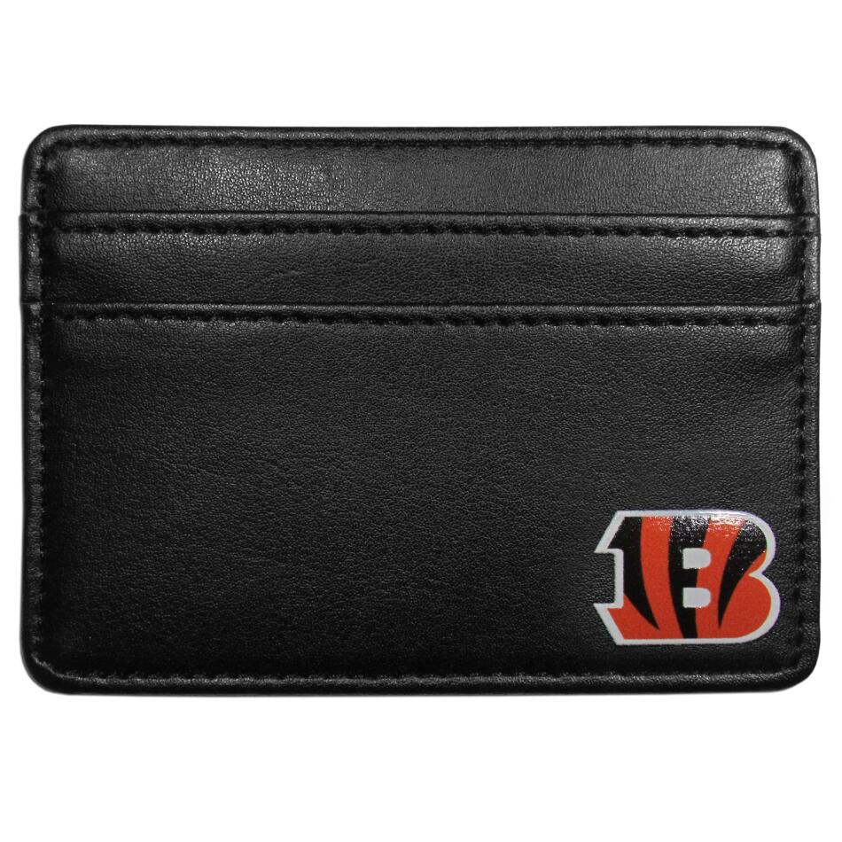 Ditch your bulky wallet! This super slim leather wallet is the perfect weekend companion. The compact design features 2 credit card slots on the front and one on the back and an inner middle pocket for cash. The front of the wallet has a crisp silk screened Cincinnati Bengals logo.