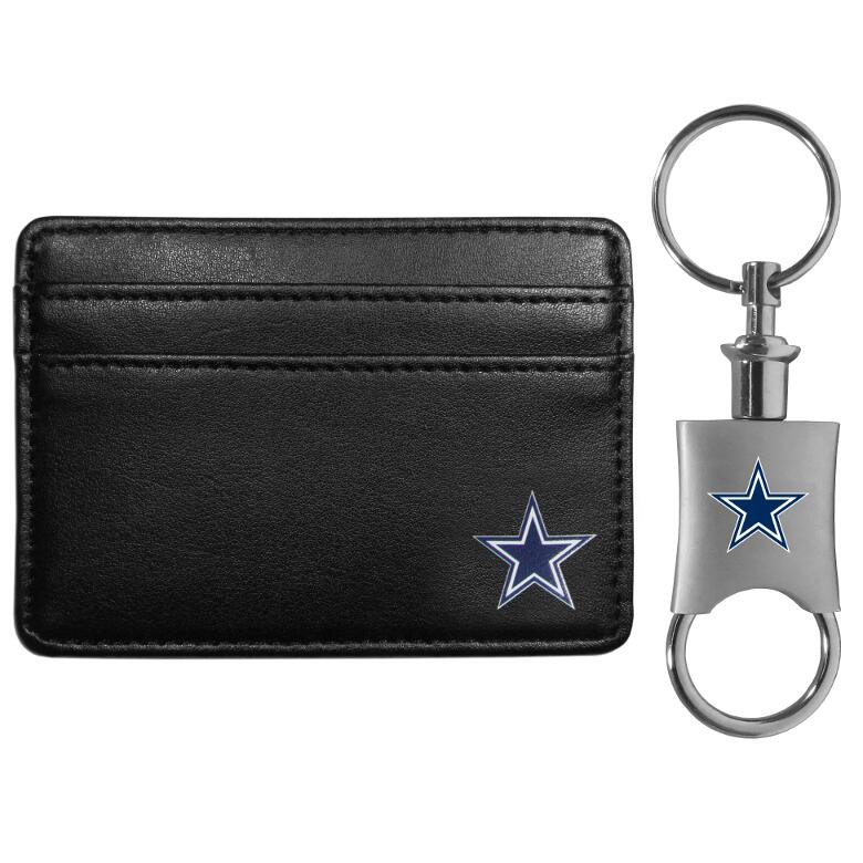 Ditch your bulky wallet! This super slim leather wallet is the perfect weekend companion and sports fan accessory. The compact design features 2 credit card slots on the front and one on the back and an inner middle pocket for cash. The front of the wallet has a crisp silk screened Dallas Cowboys team logo. This front pocket wallet is just slightly larger than a credit card and super slim but with the inner pocket and outer slots it still can hold everything that you need. Comes with a high-quality steel valet key chain. The key chain features to rings, one that easily detaches to easily for the valet to use so you do not have to risk giving out all of your keys.
