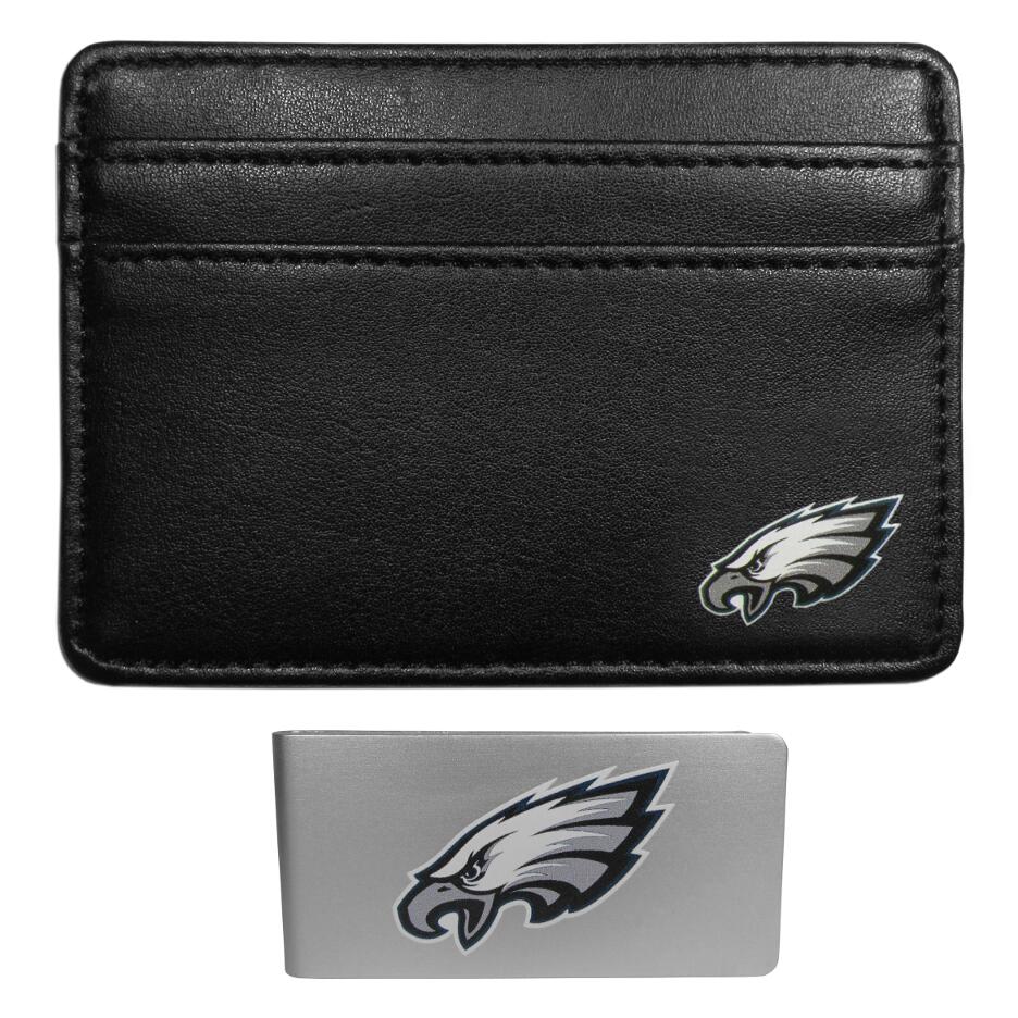 Ditch your bulky wallet! This super slim leather wallet is the perfect weekend companion and sports fan accessory. The compact design features 2 credit card slots on the front and one on the back and an inner middle pocket for cash. The front of the wallet has a crisp silk screened Philadelphia Eagles team logo. This front pocket wallet is just slightly larger than a credit card and super slim but with the inner pocket and outer slots it still can hold everything that you need. Comes with separate money clip with a brushed metal finish.
