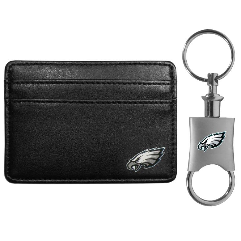 Ditch your bulky wallet! This super slim leather wallet is the perfect weekend companion and sports fan accessory. The compact design features 2 credit card slots on the front and one on the back and an inner middle pocket for cash. The front of the wallet has a crisp silk screened Philadelphia Eagles team logo. This front pocket wallet is just slightly larger than a credit card and super slim but with the inner pocket and outer slots it still can hold everything that you need. Comes with a high-quality steel valet key chain. The key chain features to rings, one that easily detaches to easily for the valet to use so you do not have to risk giving out all of your keys.