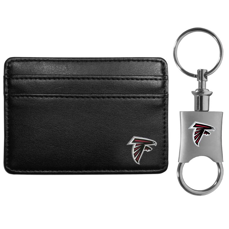 Ditch your bulky wallet! This super slim leather wallet is the perfect weekend companion and sports fan accessory. The compact design features 2 credit card slots on the front and one on the back and an inner middle pocket for cash. The front of the wallet has a crisp silk screened Atlanta Falcons team logo. This front pocket wallet is just slightly larger than a credit card and super slim but with the inner pocket and outer slots it still can hold everything that you need. Comes with a high-quality steel valet key chain. The key chain features to rings, one that easily detaches to easily for the valet to use so you do not have to risk giving out all of your keys.