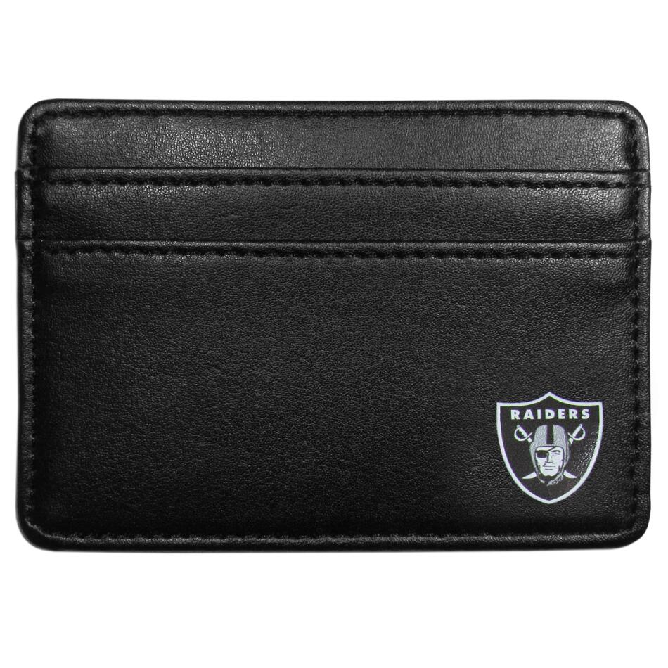 Ditch your bulky wallet! This super slim leather wallet is the perfect weekend companion. The compact design features 2 credit card slots on the front and one on the back and an inner middle pocket for cash. The front of the wallet has a crisp silk screened Las Vegas Raiders logo.
