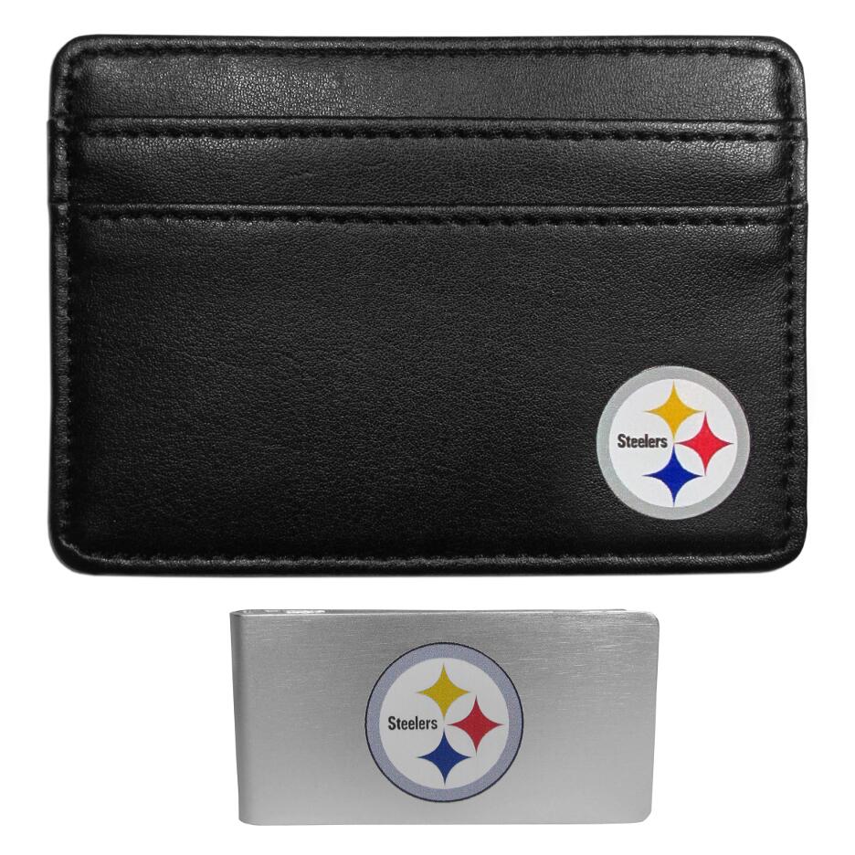 Ditch your bulky wallet! This super slim leather wallet is the perfect weekend companion and sports fan accessory. The compact design features 2 credit card slots on the front and one on the back and an inner middle pocket for cash. The front of the wallet has a crisp silk screened Pittsburgh Steelers team logo. This front pocket wallet is just slightly larger than a credit card and super slim but with the inner pocket and outer slots it still can hold everything that you need. Comes with separate money clip with a brushed metal finish.