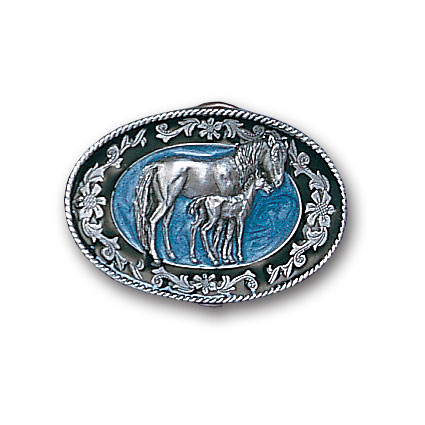 This beautiful petite buckle has a mare with her colt in the center and floral and rope design around. This exquisitely carved buckle is made of fully cast metal with a standard bale that fits up to 2" belts. Buckle is 2-1/4" x 1-1/2". Buckle is enhanced with blue and black enamel.