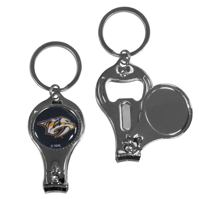 This unique Nashville Predators key chain has 3 great functions! The key chain opens to become a nail clipper, when open you can access the nail file pad and the key chain has a bottle opener.