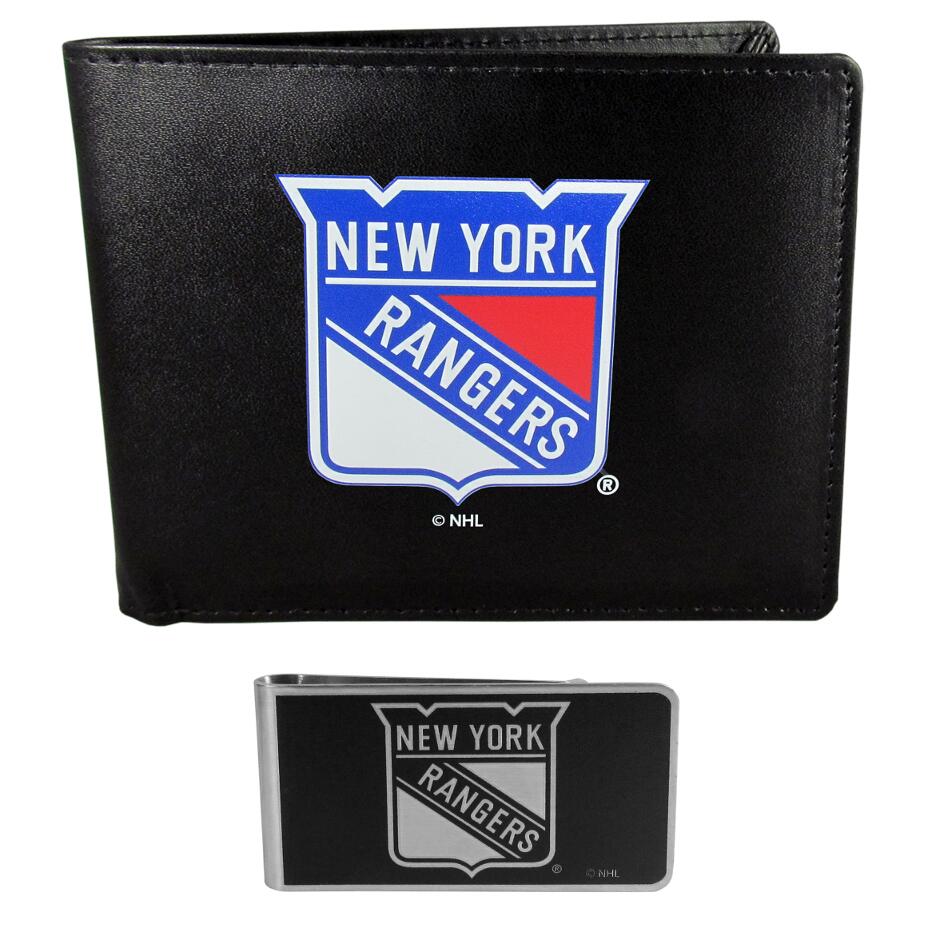 Sports fans do not have to sacrifice style with this classic bi-fold wallet that sports the New York Rangers extra large logo. This men's fashion accessory has a leather grain look and expert craftmanship for a quality wallet at a great price. The wallet features inner credit card slots, windowed ID slot and a large billfold pocket. The wallet comes with separate steel money clip with a classic black & metal finish.